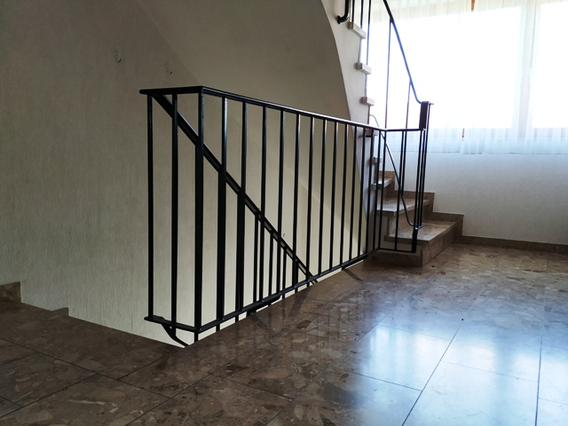 Treppenhaus mit Steinfußboden und Metallgeländer