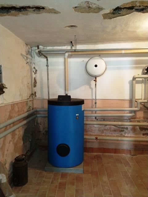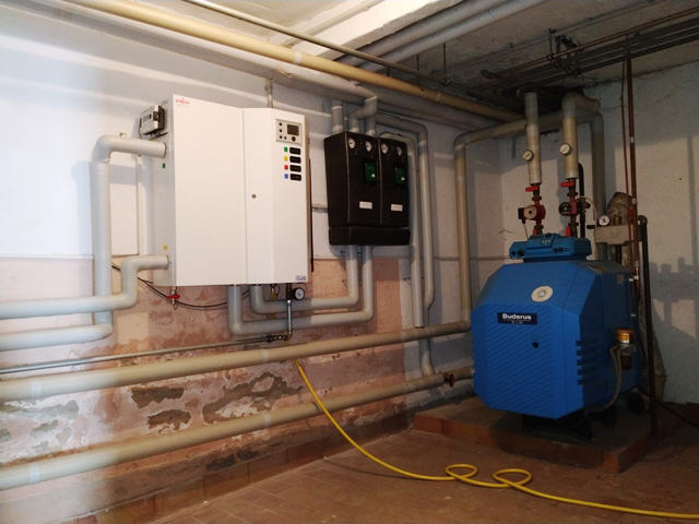 Technikraum mit Nahwärme und Wasserboiler sowie Heizölbrenner (Backup)