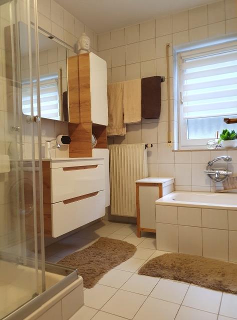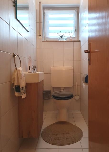 Im Badezimmer, der Gäste-Toilette und der Küche wurden Fliesen, in allen anderen Räumlichkeiten Laminat verlegt.