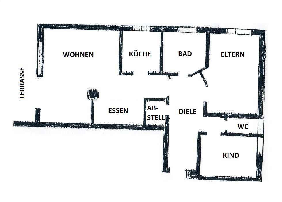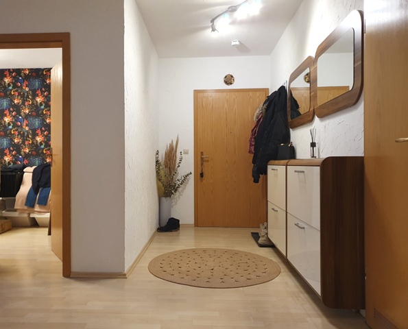 In der Wohnung erwartet Sie eine Diele mit Zugang in alle Räumlichkeiten. Auf der rechten Seite befinden sich das Kinderzimmer, die Gäste-Toilette mit Tageslicht und das Schlafzimmer. Geradeaus liegt das Tageslichtbad, welches eine Badewanne, eine Dusche, ein WC und einen Waschmaschinenanschluss umfasst. Des Weiteren erwartet Sie linkerhand ein Abstellraum, die Küche sowie das geräumige Wohn- und Esszimmer mit Zugang zur großzügigen teilüberdachten Terrasse. Im Wohn-/Esszimmer befindet sich als Highlight außerdem ein integrierter Zimmerbrunnen.